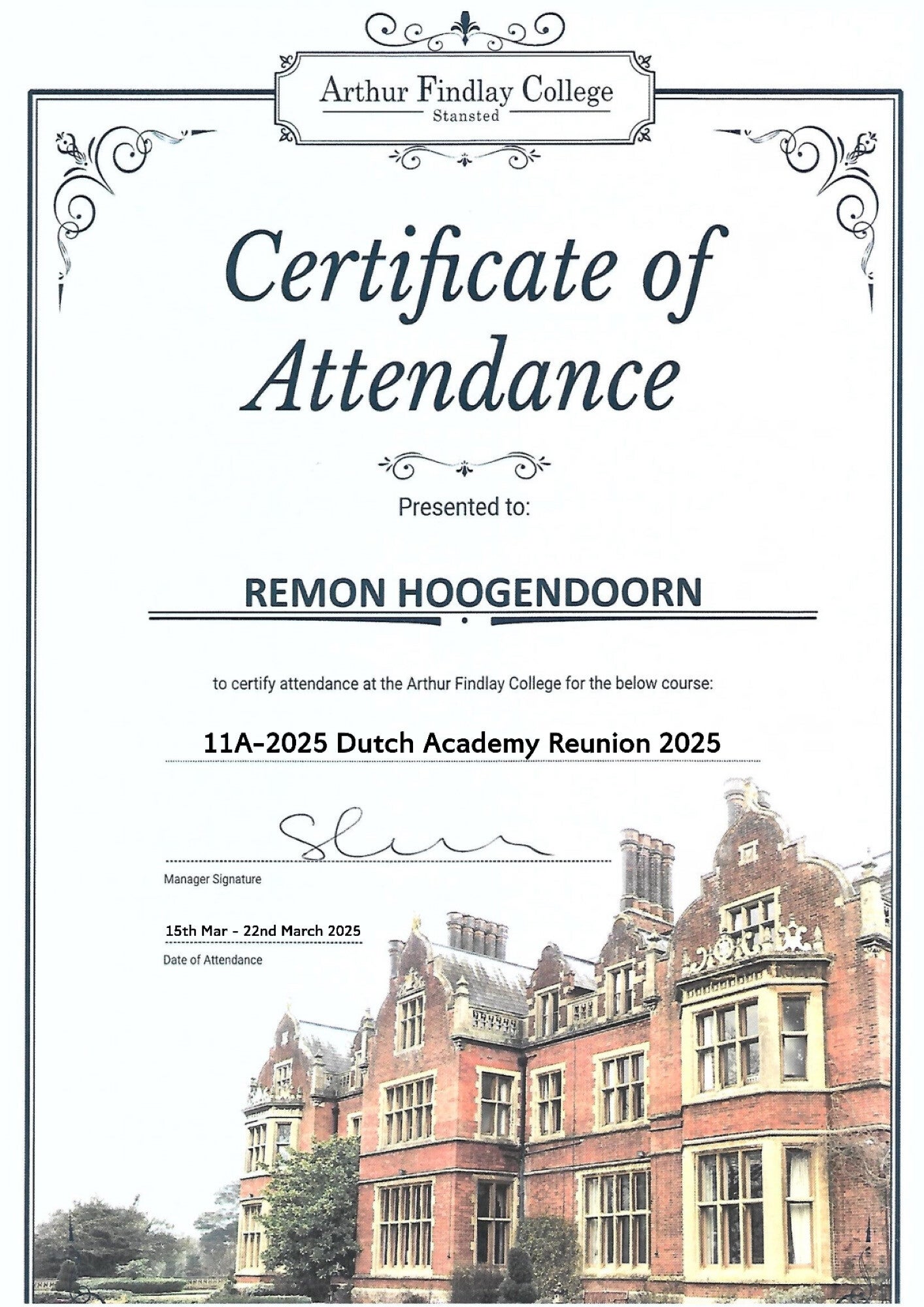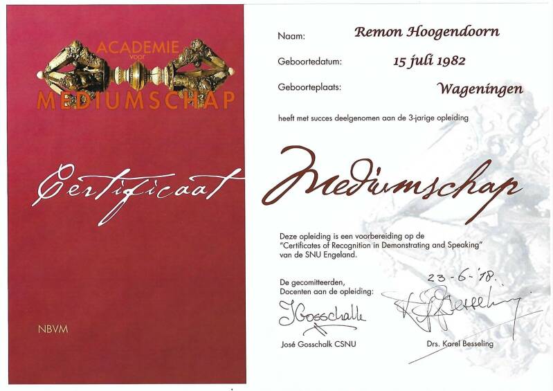 Ik heb mijn diploma behaald voor de 3-jarige beroepsopleiding aan de Academie voor Mediumschap te Naarden. Tijdens mijn studie heb ik hard gewerkt. Ik heb les gehad van docenten uit het befaamde het Arthur Findlay College, zaaldemonstraties gegeven en ik heb deelgenomen aan verschillende academieweken.